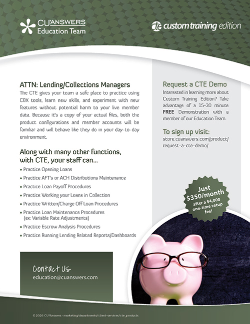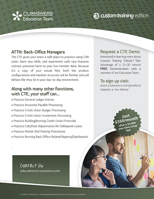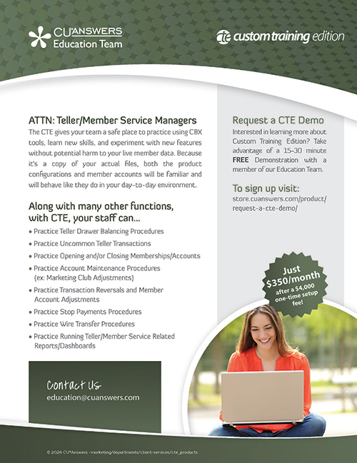 The Custom Training Edition (CTE) is a new alternative to the shared simulated training environment (Bedrock Community CU) currently used by all CU*Answers online clients. For a one-time setup fee plus a monthly maintenance fee, you can have a copy of your own membership data set up as a training environment, available only to your credit union’s employees.